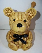 Vintage Ceramic Bear Shaped Woven Design Honey Pot w Wood Dauber