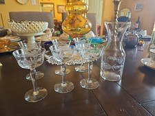Vintage Wine Glass and Carafe 7 PC Set By Messina Zanes Hand Engraved Circa 1965