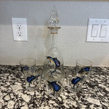Vintage decanter & 5 Whiskey Glasses Hand Painted Raised Enamel Sailfish Marlin