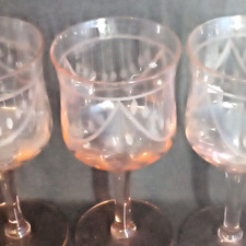 4 Pink Glass Antique Etched Wine Glasses Goblets Vertical Line Leaf Swag 10oz
