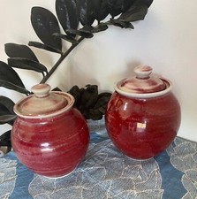 Ceramic Pots with Lids Red Stoneware Urns Set of 2 Sugar Coffee Jar Vintage