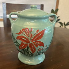 Vintage USA Green Urn Style Cookie Jar Pot - Red Flower Floral Design 9"T x 8"W