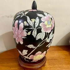 Vintage, Floral Large, Temple Jar or Urn with Wooden Stand 15in x 8.5in
