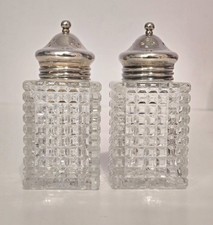 Antique Crystal Block Pattern Muffineer/Salt Pepper Shakers Silver Caps England