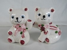Vintage Teddy Polar White Bears Pink Ribbons Flower Salt and Pepper Shakers