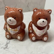 Vintage Ceramic Brown Teddy Bears with Bibs Tea Picnic Salt & Pepper Shakers