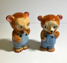 Vintage Teddy Bears in Overalls Salt and Pepper Shaker Set 4 1/2 Inches Tall