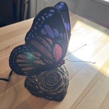 Tiffany Style Butterfly Lamp Purple Stained Glass On Bronze Rose Base TESTED