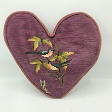Antique Heart Needlepoint Pillow Flowers Florals Birds Mauve Victorian Valentine