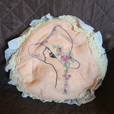Antique 20's Embroidered Accent Pillow Profile Woman Flowers Lace Edge
