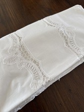 Pair antique white linen & lace embroidered cutwork king pillowcases 22"x35"