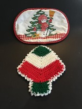 2 Vintage Christmas Pot Holders Crocheted Handcrafted Mid Century Mushroom Oval