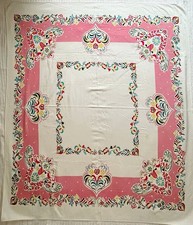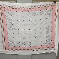 VTG Mid Century Tablecloth White Pink Bohemian Folk Grannycore 43”x 48”