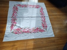 Vintage Mid Century cotton Floral Tablecloth , pink flowers, 48" X 52"