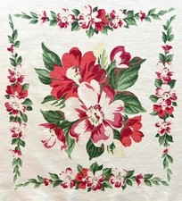 Mid Century Modern Vintage Cotton Tablecloth Floral Red Pink Green 41.5 x 45.5
