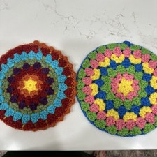 Hand Crocheted Pot Holders Hot Pads Round Multicolor 7.5” Mid Century Modern