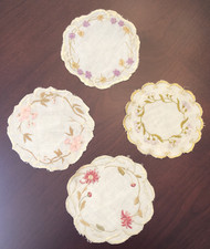 4 Antique Victorian Society Silk Embroidered Linen Floral Coasters Handmade 4.5"