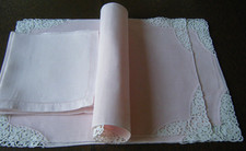 Antique linen set 4 placemats w schiffli lace 4 napkins ladder lace light pink
