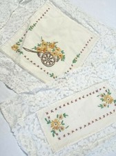 Vintage Antique Set 3 Handmade Cloths Lace Doilies Primitive Country Embroidered