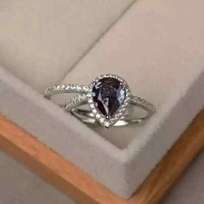 2Ct Pear Cut Alexandrite Bridal Set Halo Engagement Ring 14K White Gold Finish