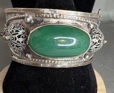 Antique Silver Tone Bangle Bracelet Large Green Onyx Stones Filigree