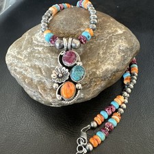 Multicolor Turquoise Spiny Navajo Sterling Silver Cluster Pendant Necklace 19642