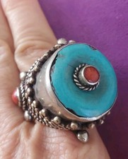 Antique Natural Old Turquoise & Coral Handmade Tibetan Ring Size 11