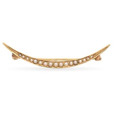 Antique Victorian 14K Yellow Gold Seed Pearl Crescent Moon Brooch