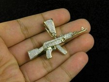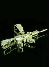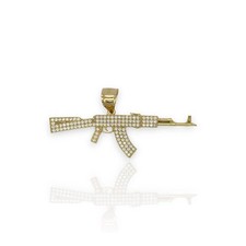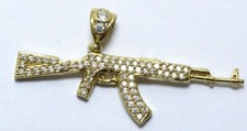 Men Gun Pendant Yellow Gold 0.89" x 2.5" AK-47 Gun Riffle Stones Pendant -NEW