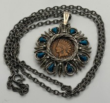 1892 Indian Head Penny & Turquoise Pendant With Chain Marked Roma