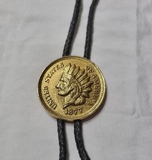 VTG Gold tone 1877 Indian Head Penny Bolo Tie Black Leather Cord Reproduction
