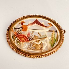 Vintage circa 1950-s Intaglio Cameo Gold Tone Asian Rickshaw Ornate Brooch
