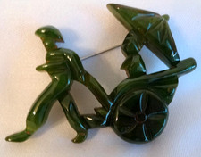 Antique Vtg Chinese Asian Oriental Motif Rickshaw Green Bakelite Pin Brooch