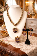 VTG Heavy Victorian Necklace Earrings Pendant Set Brass/Amethyst Art Glass L@@K!