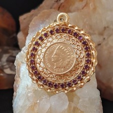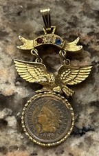 Vintage 1900 Indian Head Penny Flying Eagle Pendant, Gold Tone with 3 Gemstones.