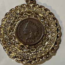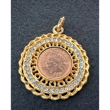 Vintage 1896 Indian Head Penny Pendant embedded coin Goldtone Rhinestone Accent