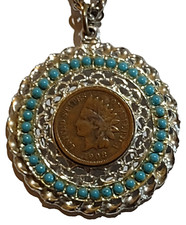 Vintage 1907 Indian Head Penny Turquoise Silvertone Filigree Medallion Necklace