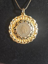 VTG 1896 Indian Head Penny Pendant Gold Tone Surrounded Beautiful Design