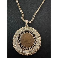 Vintage Gold Tone 1896 Indian Head Penny & Rhinestones Pendant Necklace 24"