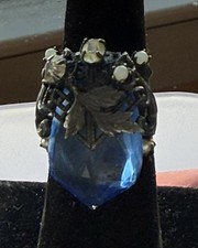 Vintage Arts Crafts Ring Blue Czech Glass Shield Moonstone Paste Statement