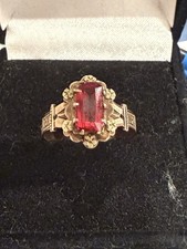 Antique Art Deco Yellow 14K Gold Ring Emerald Cut Red Gemstone Sz8 Marked Annie