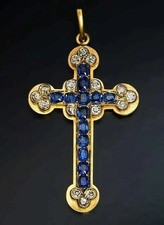 14K Yellow Gold Plated 2 CT Lab Created Blue Sapphire Antique Cross Pendant