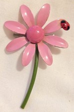 Vintage Mid Century Metal Enamel Pink Flower Brooch w/ Stem & Ladybug