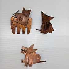 Mid Century Modern Copper Cat Dog Animal Brooch Pin Lot of 3 Brutalist