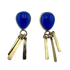 Vintage Mid Century Modern Polished Brass Cobalt Lucite Bezel Dangle Earrings