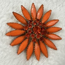 Vintage Mid-Century Orange Rhinestone Flower Brooch Pin Gold Tone Sunburst