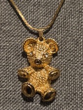 Vintage Gold Tone Teddy Bear Clear Eyes Necklace 16" chain
