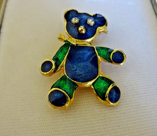 VINTAGE BLUE & GREEN ENAMEL TEDDY BEAR BROOCH RHINESTONE EYES