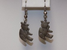 J974-VINTAGE PIERCED EARRINGS~TEDDY BEARS~PEWTER LOOK~1.5" DANGLE