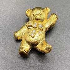 Vintage Teddy Bear Toy Textured GoldTone Clear Crystals 1.5” Pin Brooch